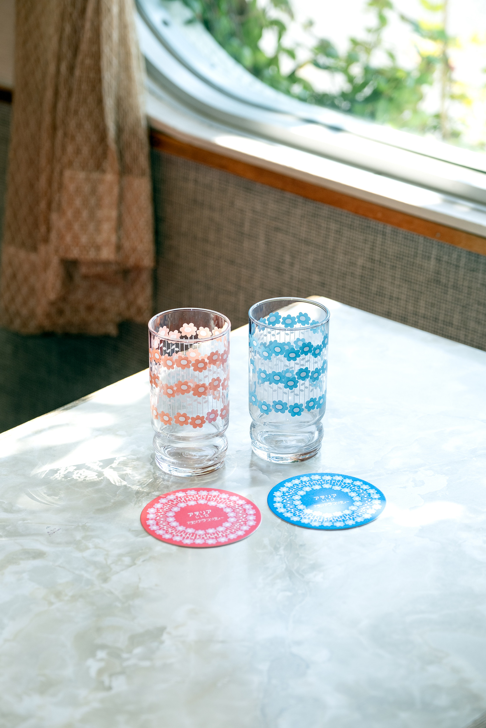 ストライプの花柄がかわいらしい「アデリアラプソディー」は、昭和48(1973)年に発売された柄です。昭和当時は、グリーンの磨りガラス調の脚付きグラスにプリントされていました。グラスにお行儀良く列んだお花たちがなんとも愛らしく、見る人をどこかほっこりとした気持ちにさせてくれます。