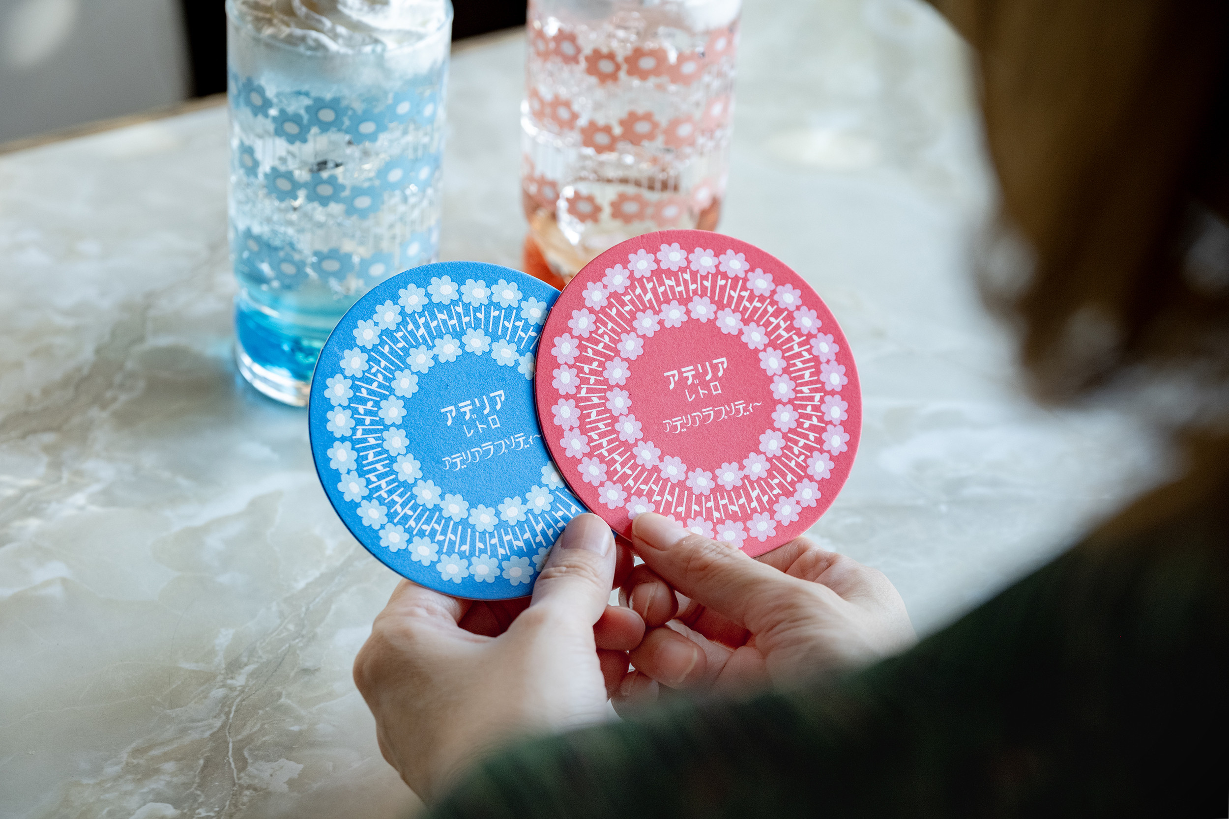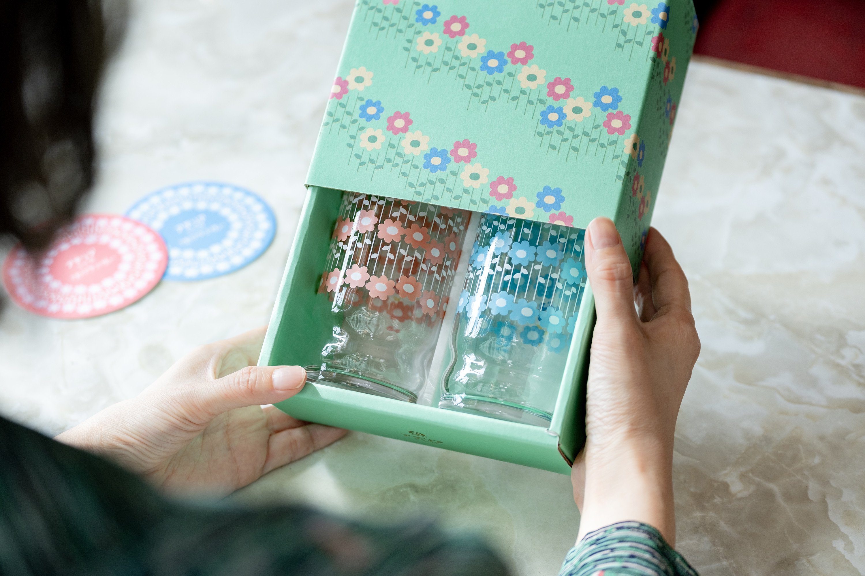 オリジナルの紙コースター&かわいらしいギフトボックス付きのペアセットです。