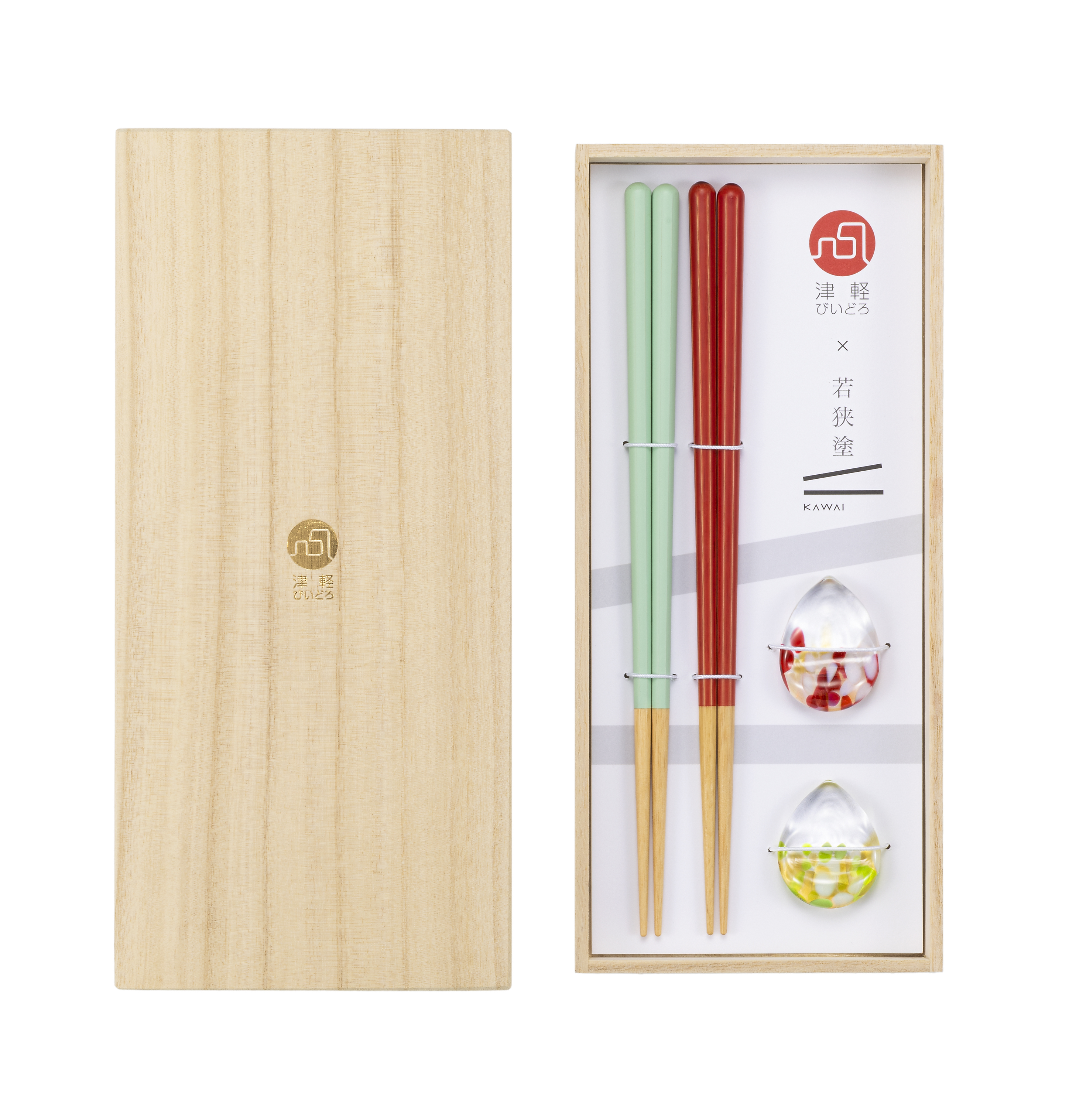青森を代表する果実「りんご」を表現した、津軽びいどろの「箸置き」と若狭塗のお箸の伝統工芸品コラボセットです。