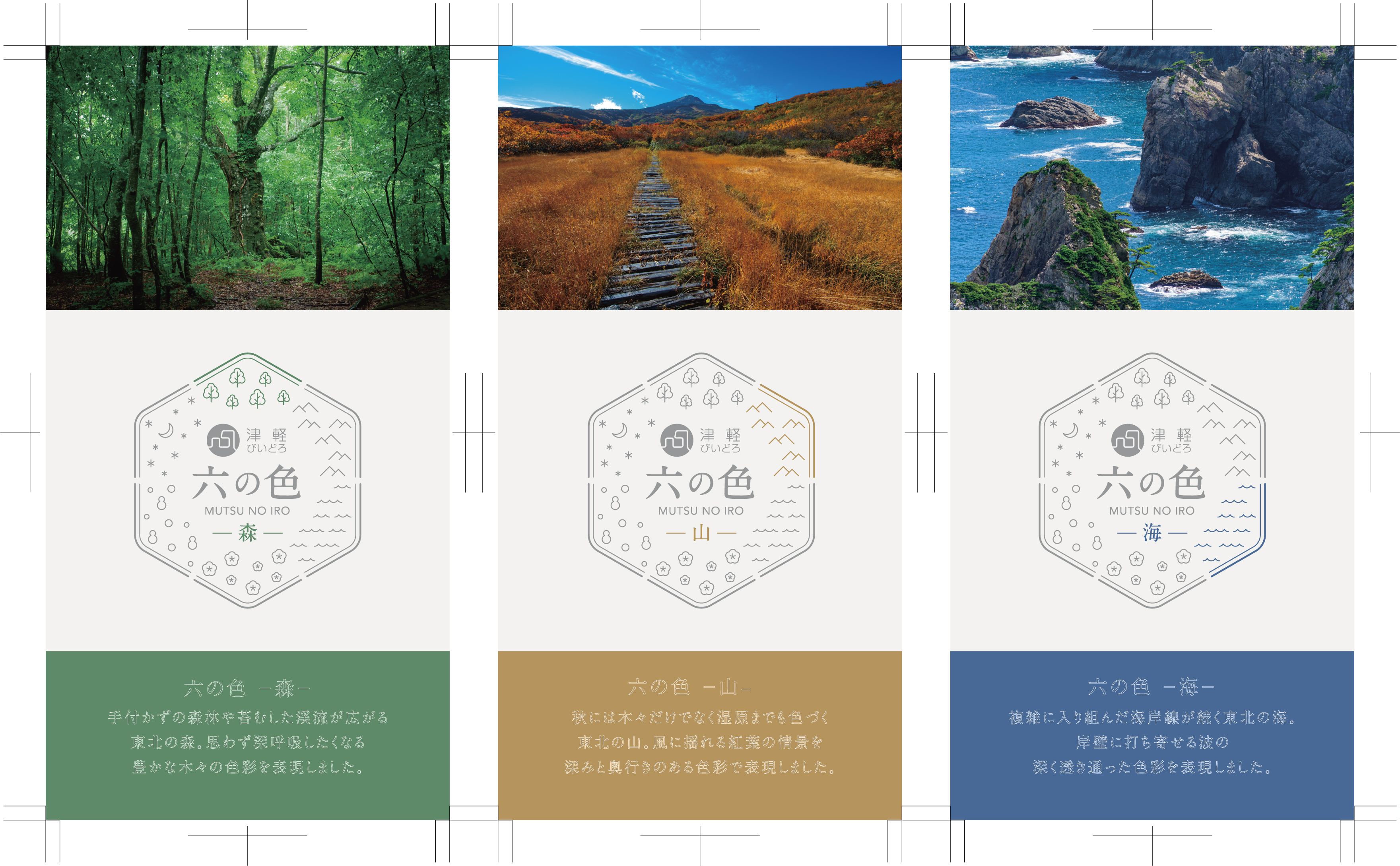 東北地方(陸奥)を象徴する森、山、海、花、雪、夜、6つの自然の情景を色ガラスをひねる技法で表現しました。